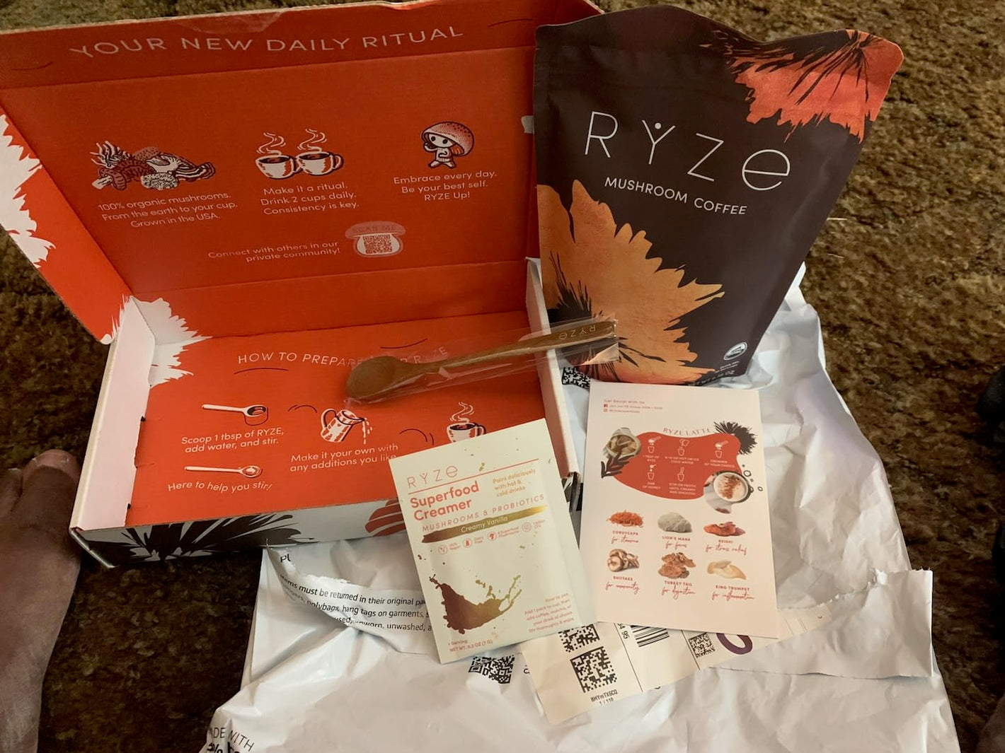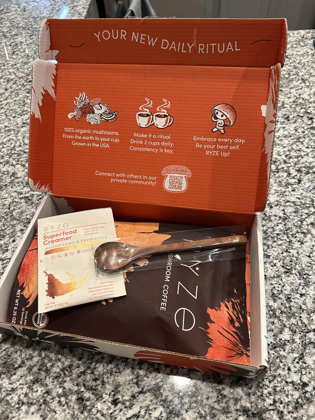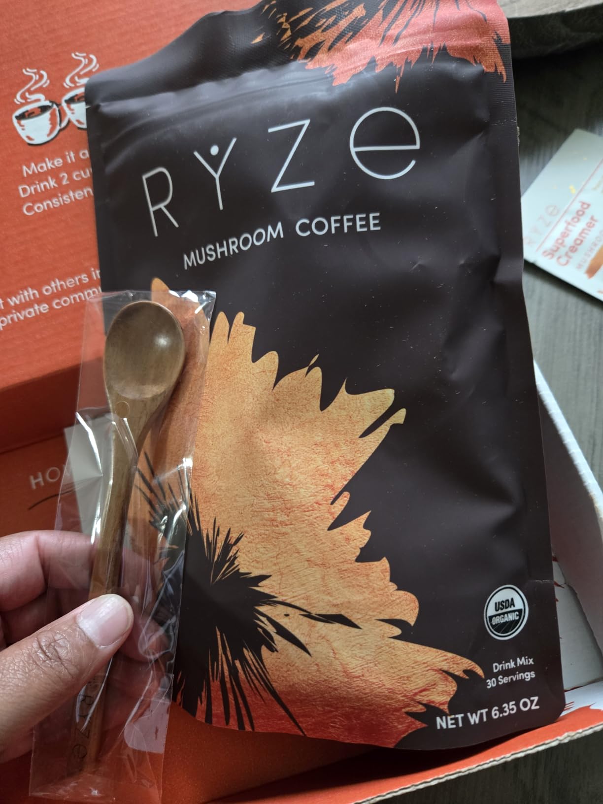 Me encanta la caja en la que venía el café. Todo estaba perfecto. También me encanta la cuchara para remover. El café estaba delicioso con la crema probiótica y un poco de leche de avena. El único inconveniente es acostumbrarse al sabor a hongos... Recomiendo tomarlo con azúcar o crema. Lo que más me gusta es que el producto es 100 % orgánico.
