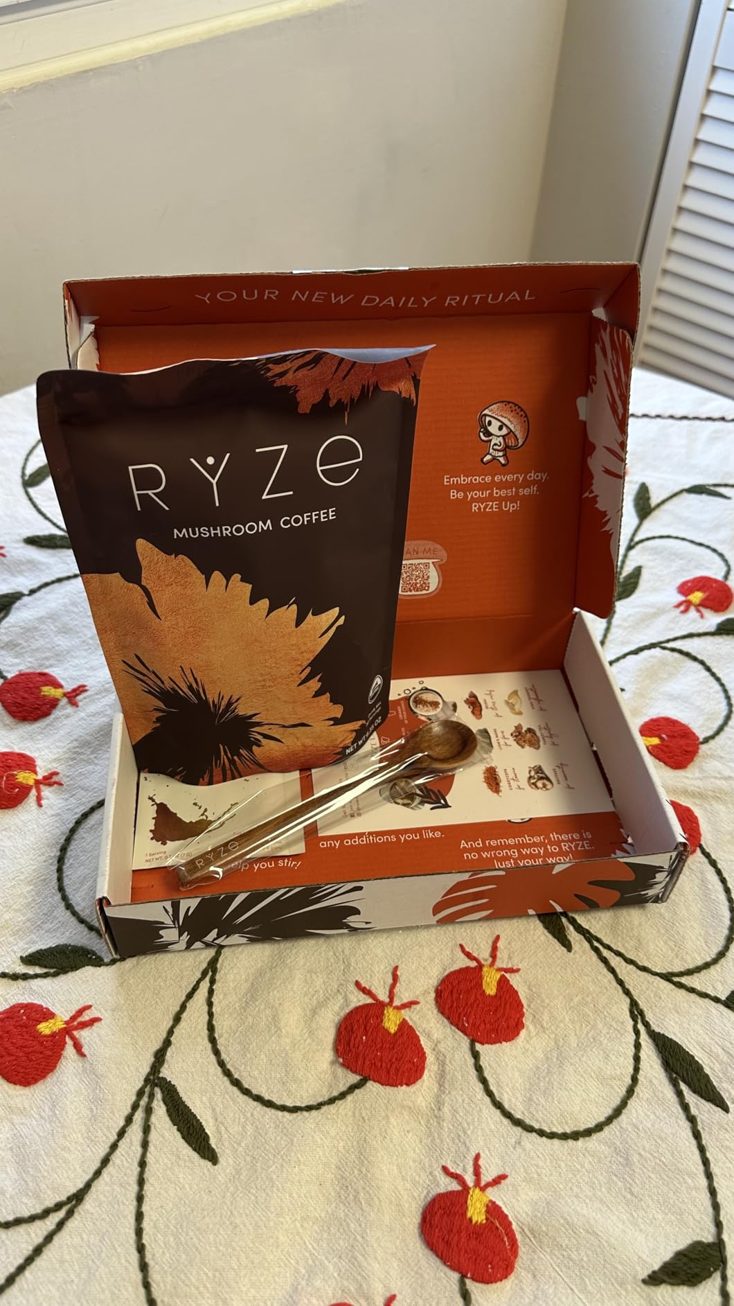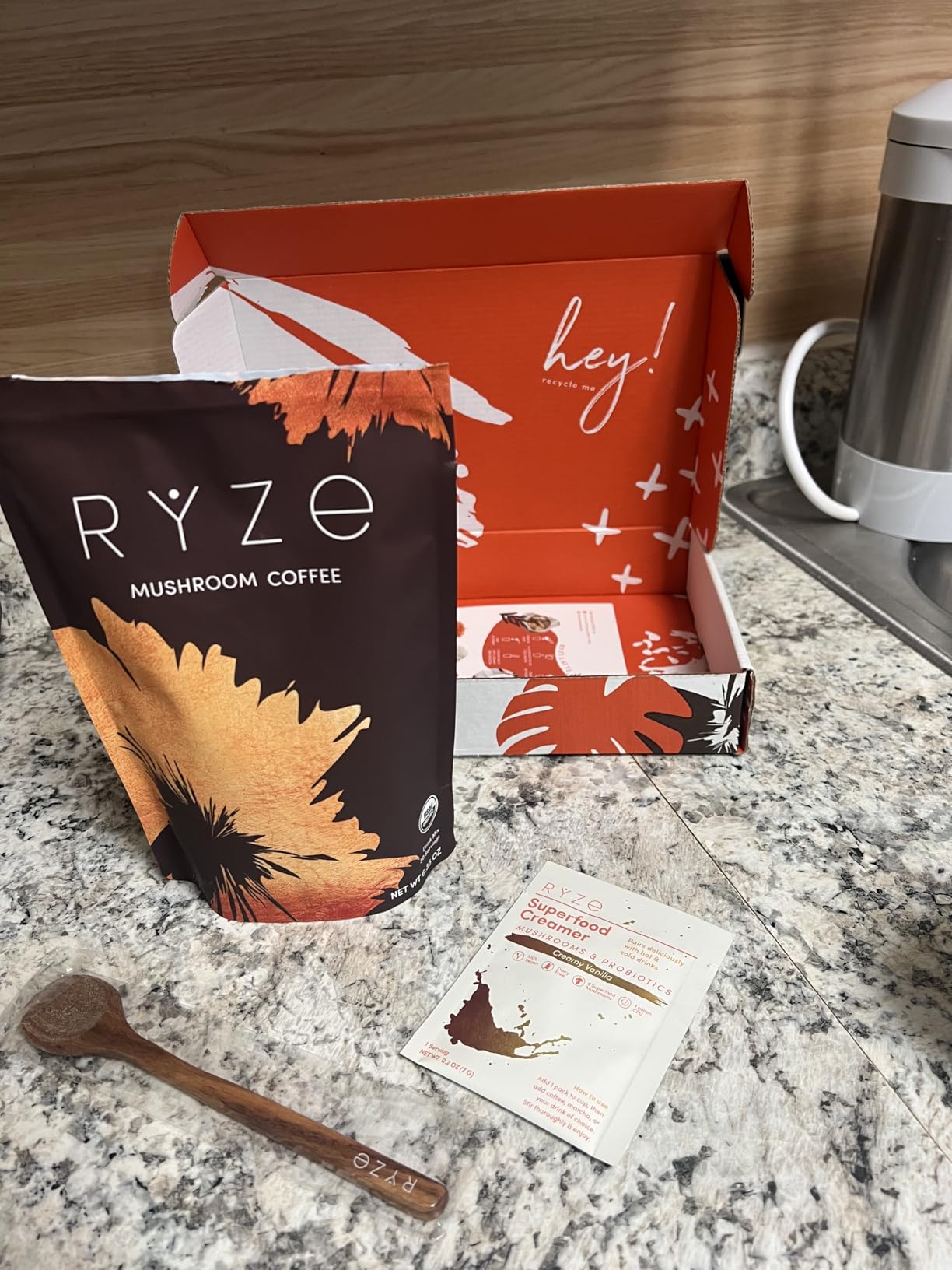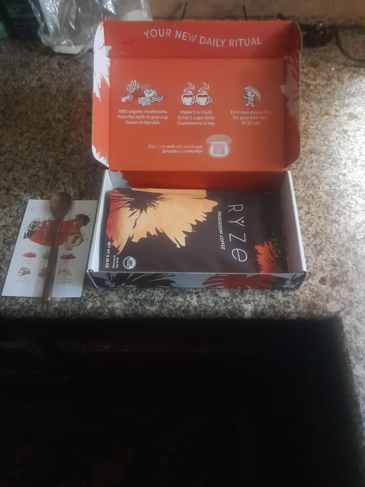 Me encanta la caja en la que venía el café. Todo estaba perfecto. También me encanta la cuchara para remover. El café estaba delicioso con la crema probiótica y un poco de leche de avena. El único inconveniente es acostumbrarse al sabor a hongos... Recomiendo tomarlo con azúcar o crema. Lo que más me gusta es que el producto es 100 % orgánico.